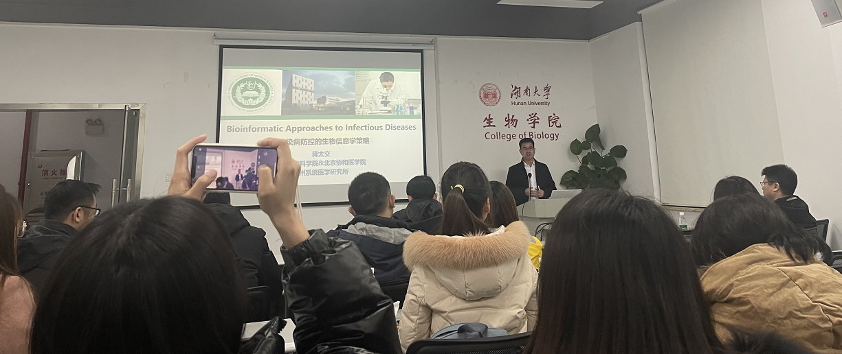 传染病对人类社会造成了巨大的危害。蒋太交教授长期从事病毒性传染病的生物信息学研究。此次报告蒋教授从传染病的危害,防控策略和挑战出发,提出如何基于海量的传染病大数据,特别是高通量测序数据,通过发展生物信息学方法对病毒性传染病进行更加有效防控的策略;最后以2013年禽流感H7N9病毒的溯源与新冠病毒的注释和进化研究等作为例子,介绍生物信息学在传染病防控中的重要应用价值。蒋教授的精彩报告引起了在座师生的强烈兴趣与热烈讨论。