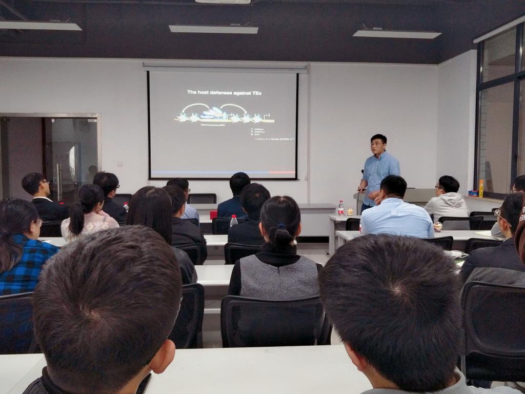 袁教授的报告新颖有趣,他首先给大家推荐了一本与生物进化相关的英文书籍《The Selfish Gene》,并以此为引子,过渡到其科研领域:DNA重复序列在真核胚胎发育和癌症表观遗传调控中的关键作用。袁教授分别介绍了PRC complex介导的H3K27me3在果蝇早期胚胎发育(细胞分裂)中的重要作用,以及结直肠癌中DNA重复序列受SWI/SNF complex调控重新激活的故事。袁凯教授的精彩报告引起了在场师生们的广泛讨论和积极提问,体现了公司蒸蒸日上的良好科研风气,最后讲座在一片掌声中结束。