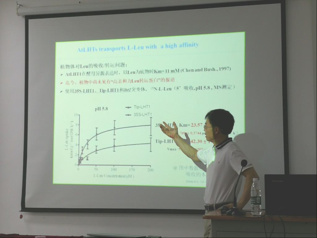 6月12日,中国农业大学资环公司植物营养系刘来华教授到公司进行学术交流,并做《Plant root system growth in response to external amino acids》的精彩学术报告。刘来华教授的报告介绍了其课题组在植物根系响应外源氨基酸的机理、植物氨基酸转运蛋白方面的研究进展,重点讲解了关于拟南芥谷氨酸转运蛋白AtGLR2.5和亮氨酸和异亮氨酸转运蛋白LHT1的研究。刘来华教授生动地阐明了植物根系特异感知外源谷氨酸和亮氨酸,并通过氨基酸转运蛋白介导目的氨基酸转运的机制。刘教授的工作新颖扎实,报告清晰有趣,激起参会师生的广泛兴趣。报告后,刘来华教授与球王会师生进行了深入的讨论。