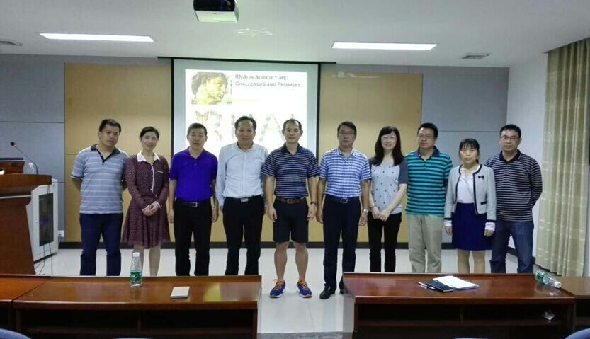 2015年10月16日上午,美国肯塔基大学(University of Kentucky)周序国教授应邀来公司进行学术交流,为公司师生作了题为“ RNA interference in agriculture: challenges and promises”的学术报告。周博士在报告中生动地讲解了 RNA干扰技术在农业病害防治、生物医学领域等方面的发展现状及应用,非常热情地回答了各位老师和同学的提问,并给大家介绍了肯塔基大学的研究方向和背景。会后,周博士参观了公司植物功能基因组学与发育调控湖南省重点实验室,与有关教师就科研合作、员工培养开展了交流。此外,湖南省农科院植物保护研究所所长刘勇研究员、书记张德咏研究员也应邀一同前来听取报告和参加了师生的座谈。