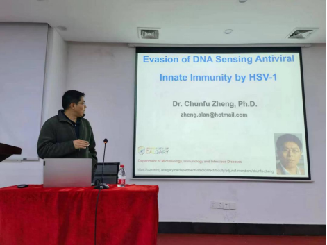 2023年4月24日下午,福建医科大学教授、加拿大University of Calgary兼职教授郑春福作为第140天马学术论坛主讲人应邀来公司进行学术交流。郑教授为公司师生介绍了其研究团队近些年在单纯疱疹病毒HSV-1如何进行免疫逃逸方面的研究工作,郑教授汇报的题目为“Evasion of DNA Sensing Antiviral Innate Immunity by HSV-1”。本次报告由邱烨副教授主持,球王会多位老师和员工参加,现场讨论激烈,学术氛围浓厚。