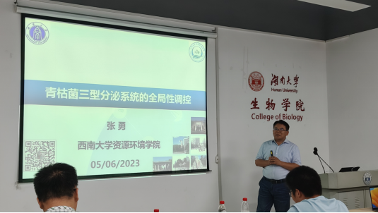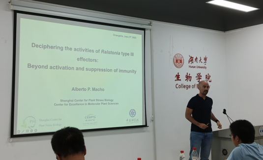 2023年6月5日下午,中科院分子植物科学卓越创新中心Alberto P.Macho研究员、西南大学张勇教授应邀来公司进行学术交流,为公司师生做了关于青枯菌Ⅲ型分泌系统调控及青枯菌Ⅲ型效应蛋白功能研究的学术报告,本次报告会由伍斗生副教授主持,公司多名师生参加。