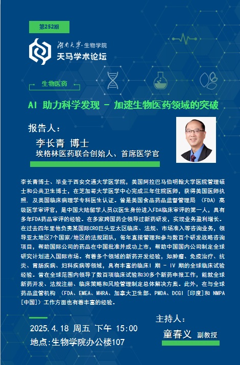天马学术论坛 第252期 埃格林医药联合创始人、首席医学官 李长青博士