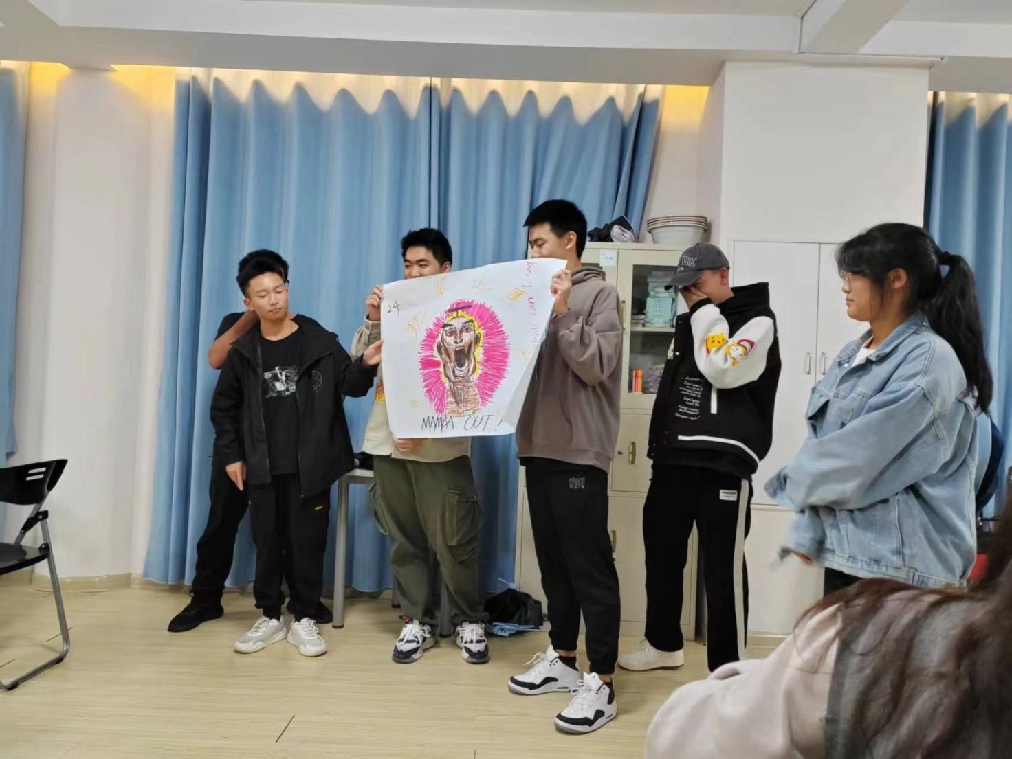第二个环节,四位同学作为“侦探”,寻找符合自己手中“寻人启事”特征的同学作为自己的小组成员。大家共分为四组,班主任老师也参与其中。接下来,每个小组分到一张白纸和一盒笔,要在白纸上共同创造属于自己小组的logo和名字。创作的过程中,小组成员们相互了解彼此,最终每组选派一位代表为大家介绍自己小组的成员。在这个环节中,大家对彼此有了更深入的了解,并团结协作属于自己小组独一无二的logo。