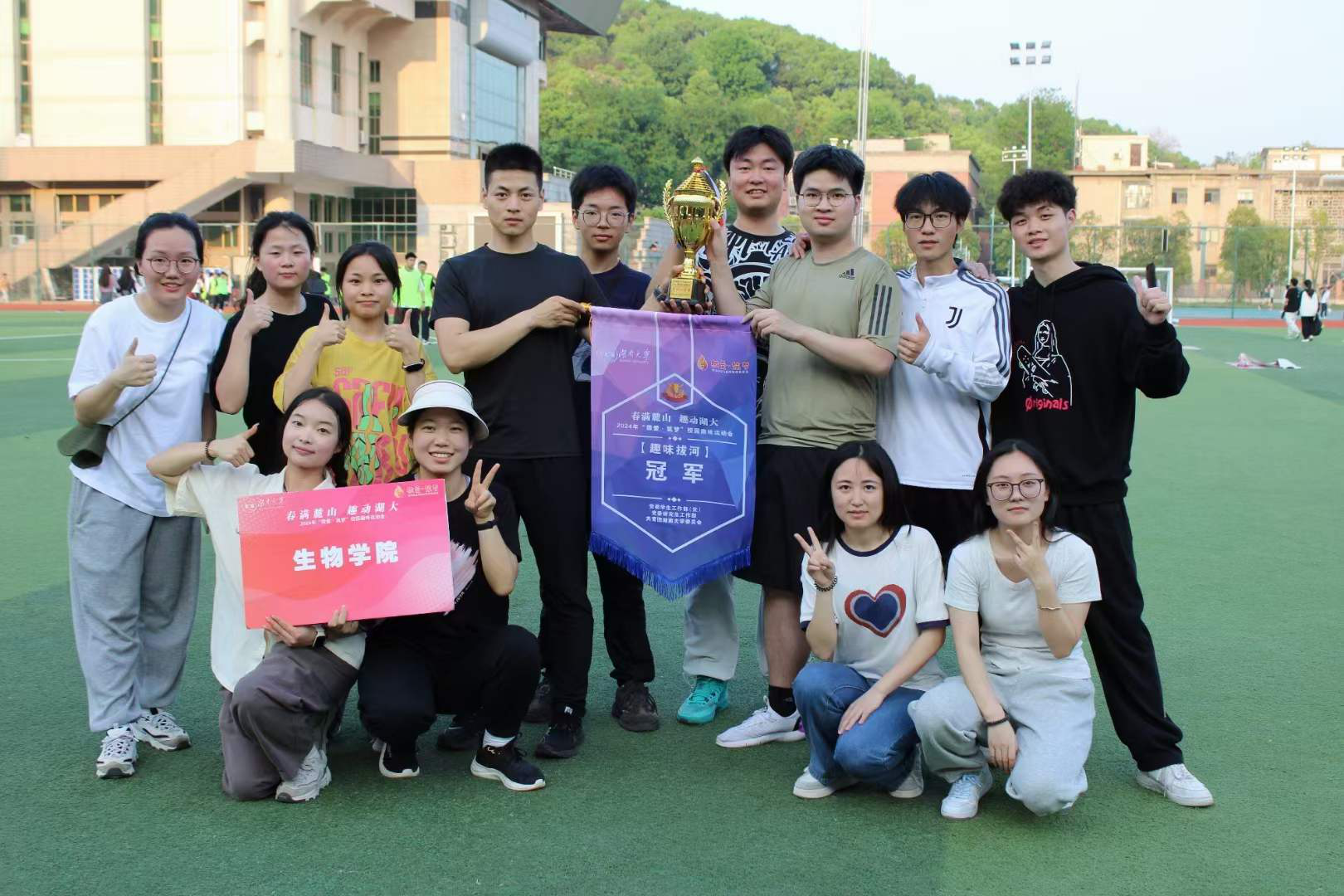 运动会接近尾声,赛事奖杯被一座座捧走,球王会急需一场胜利装点门面。正因如此,上一个项目留下的遗憾不仅没有消磨我们的意志,反而成了我们向上进取的养分。在最后一项“趣味拔河“项目中,队员们目光炙热,努力尝试抓住稍纵即逝的获胜契机,最终在指挥的冷静调动、队员的全力配合下,经过三轮鏖战,生物院淘汰了其他如狼似虎的对手,捧起最后一座奖杯。我们用擦破的手掌、力竭的肌肉、满含热泪的双眼诠释了何谓”木叶飞舞之处、我辈生生不息“。