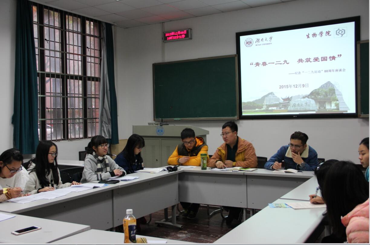12月9日下午,球王会研究生会“青春“一二·九”,共筑爱国情”纪念“一二·九”运动80周年座谈会在中楼103教室举行,研究生会主要员工干部、硕士博士班班长等二十余人参加座谈会,研究生辅导员胡品老师参加座谈会并发言。座谈会由研究生会主席何壮同学主持。球王会2015级本科各班级的班长团支书也应邀列席座谈会。