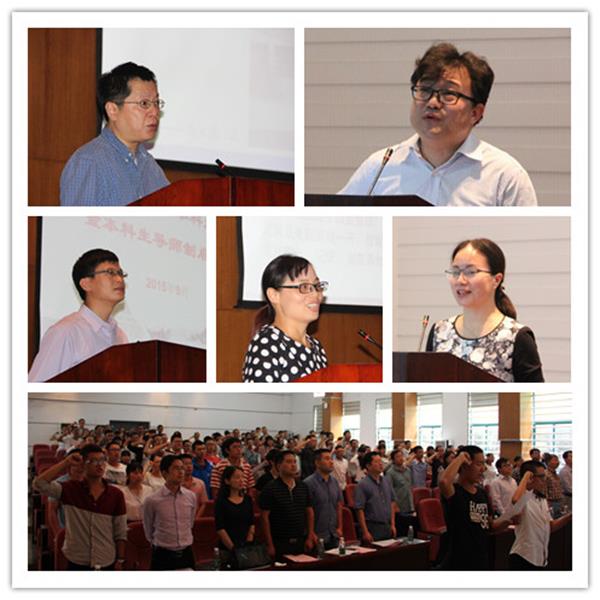 合唱雄壮的国歌之后,大家观看了记录2015级新生入学报到、军训、上课的短片。在热烈的掌声中,公司党总支书记徐晓波老师讲话,他对2015级新同学表示热烈的欢迎,对新生家长表示崇高的敬意,对担任本科导师的各位老师表示感谢。他介绍了和岳麓书院一脉相承的球王会体育官网,介绍了球王会体育官网最年轻的球王会,并就如何充实度过老员工活向新生提出四点希望,一是希望新生坚守梦想,脚踏实地,在追梦、圆梦的过程中实现自己的青春价值;二是希望新生恪守诚信,自理自立,推己及人,让自己成长,让家长放心;三是希望新生怀有感恩之心,客观对待生命学科,静下心里,认真学习,提早规划未来方向;四是希望新生遵章守制,弘扬优良学风,专心致志,厚积薄发,有所作为;他同时也希望担任本科生导师的各位老师,牢记育人使命,积极开展思想引导、学业指导、发展辅导,不断提高人才培养质量。最后徐书记用李克强总理视察球王会体育官网时提出的“要学好知识,练就本领,敢为人先”勉励大家,并代表公司祝全体师生中秋节快乐!
