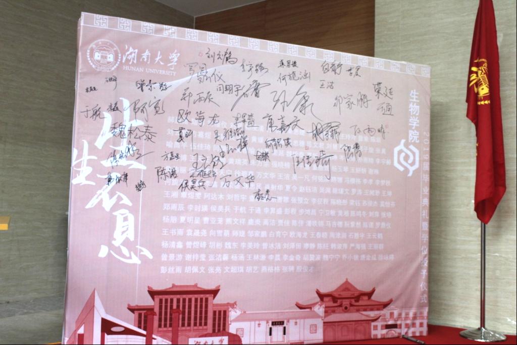 “麓山巍巍,湘水泱泱;宏开学府,济济沧沧……”在恢弘的校歌声中,全体师生歌颂母校。最后毕业生们合唱张震岳的《再见》,并纷纷来到公司设置的签名板前合影留念,表达对挚爱母校的深情,毕业典礼也在歌声中落下帷幕。