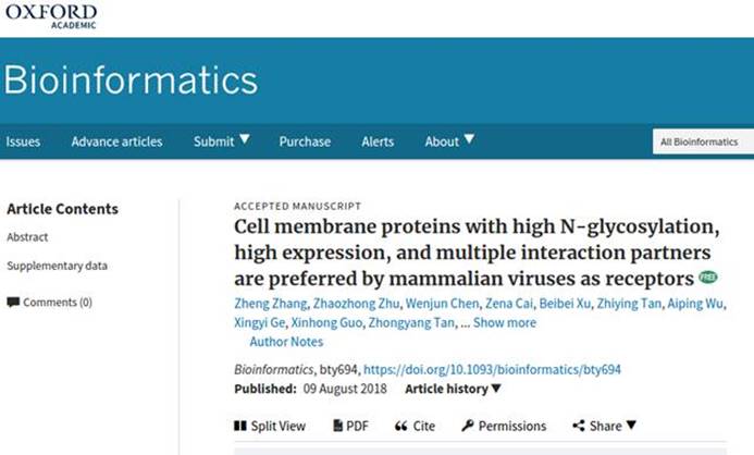 病毒受体对于病毒进入宿主细胞非常关键,很大程度上决定了病毒的组织与宿主特异性。目前病毒受体的确定主要采用实验方法,不仅费时费力,而且非常困难。科学家估计地球上可能感染人的病毒有几十万种,但迄今为止只有100多种病毒的受体得到了确定。如何更有效地确定病毒的受体是病毒学研究中的重要挑战。随着大数据时代的到来,生物信息学在生物医学研究中发挥着越来越重要的作用。2018年8月9日来自湖南老员工物信息学与病原学研究团队在国际生物信息学专业权威期刊《Bioinformatics》发表题为Membrane proteins with high N-glycosylation, high expression, and multiple interaction partners were preferred by mammalian viruses as receptors的文章。