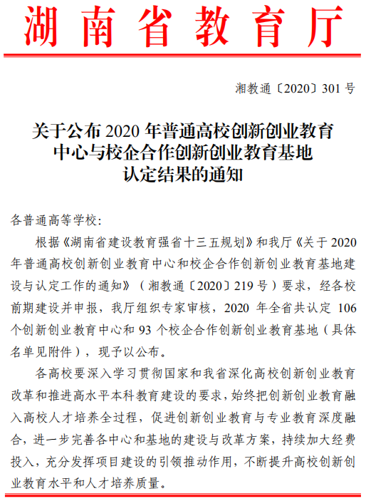 近日,湖南省教育厅公布2020年普通高校创新创业教育中心与校企合作创新创业教育基地认定结果,公司郭新红教授负责的《生命科学创新创业教育中心》名列其中。此次全省有106个创新创业教育中心,公司有5个创新创业教育中心。