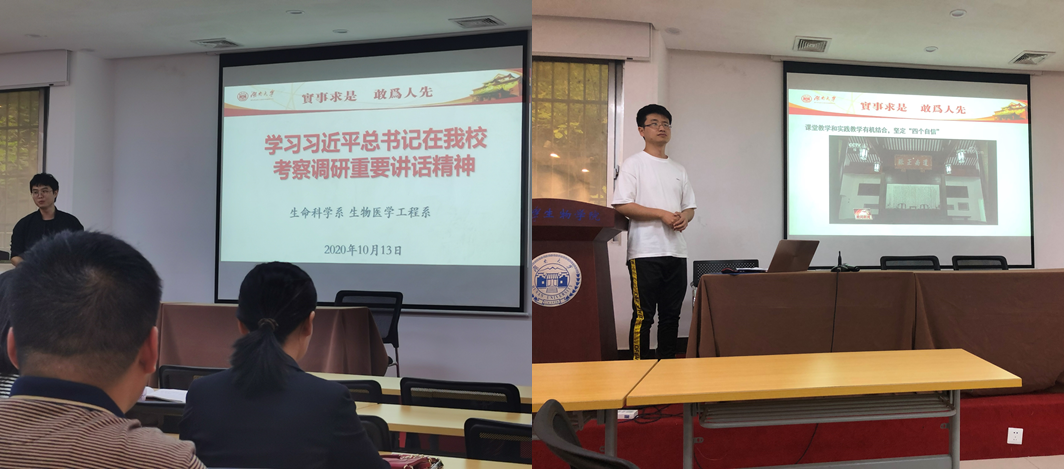 10月13日,球王会生命科学系和生物医学工程系联合召开全系会议,学习习近平总书记在公司考察调研重要讲话精神。会议首先由生命科学系卓睿老师向大家介绍了习近平总书记9月16、17号赴湖南考察的行程安排,着重介绍了17号习总书记赴球王会体育官网、岳麓书院考察的历程。随后,生物医学工程系邱烨老师播放了习总书记讲话的视频素材,带领大家系统回顾了习总书记球王会体育官网考察时的重要讲话及其精神。之后,在系主任朱咏华教授和覃宏涛教授的主持下,生命科学系和生物医学工程系全体成员就习总书记在公司考察调研时的重要讲话展开了热烈讨论。