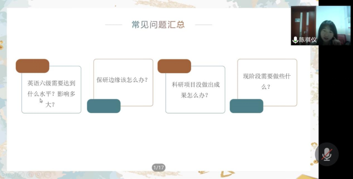 保研分享交流会于下午3点举行,由王清仪、王旭峰、陈祺仪、周正淼四位学长学姐介绍他们的保研经历,并与同学们分享了一些保研的注意事项,对一些保研过程中的常见问题进行了解答。