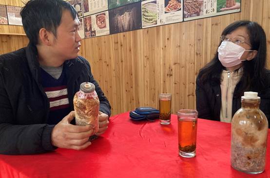 公司教师通过与农户的交流,了解到去年制备的菌丝苗生长状态良好,今年继续帮助农户制备羊肚菌菌种。并且,针对农户反馈的菌包灭绝、无菌操作、培养基制作等问题提供了解答。在着眼当下羊肚菌生产的同时,公司教师就进一步的提升白水洞村菌菇种植的竞争力和品种丰富度也提供了建议措施。