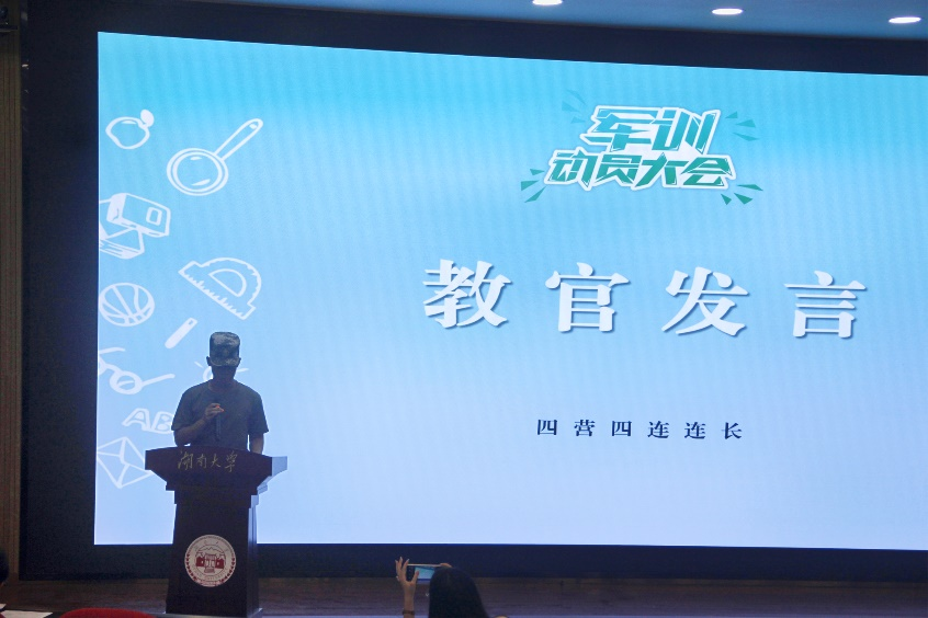 会议第二项,由四营四连连长林教官进行发言,林教官首先祝贺同学们开启老员工活,接着对于军训提出几点要求:遵守纪律、听从指挥,保持良好的军容风纪,按照要求整理内务等,并鼓励同学们放平心态,以积极的心态面对挑战,最后预祝同学们圆满完成军训各项任务。