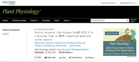 2021年5月22日,Plant Physiology在线发表了球王会郭新红课题组题为“Lectin receptor-like kinase LecRK-VIII.2 is a missing link in MAPK signaling-mediated yield control”的研究论文,揭示了拟南芥凝集素类受体激酶LecRK-VIII.2作用于MAPK信号转导途径上游,参与调控包括角果数量、种子大小和数量在内的产量相关性状,并通过协调源库关系,促进根、茎、叶的生长,在作物改良方面具有重要的潜在利用价值。