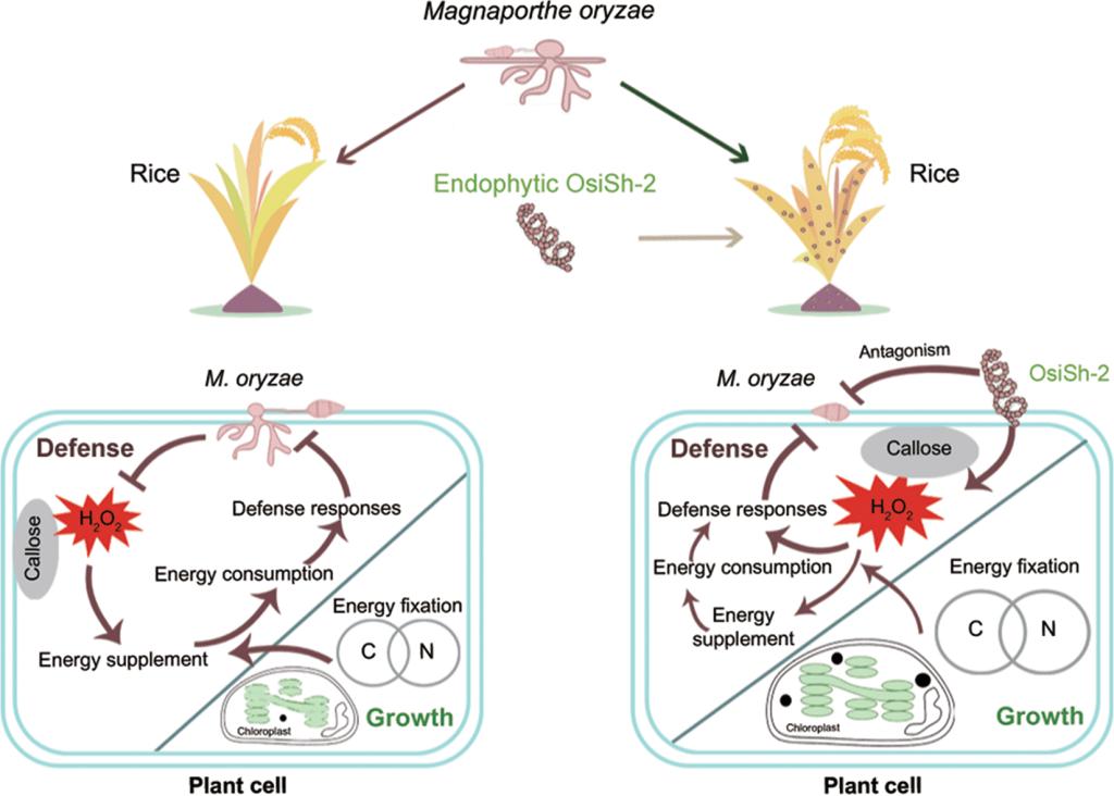 图2.内生放线菌OsiSh-2调控水稻生长和防御平衡的作用模式图