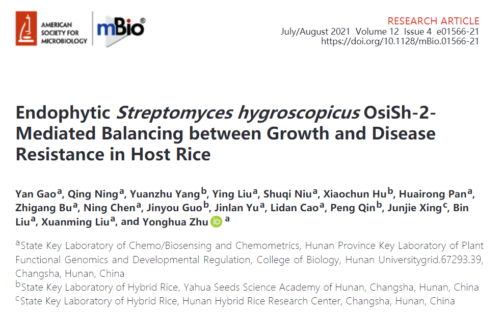 2021年8月10日,美国微生物综合顶级开源期刊mBio在线发表了来自球王会植物-微生物互作科研团队题为“EndophyticStreptomyces hygroscopicusOsiSh-2-Mediated Balancing between Growth and Disease Resistance in Host Rice”的研究论文。该研究揭示了内生放线菌OsiSh-2与水稻形成共生体,诱导宿主水稻进入“防御警备”状态,增强抗病能力的同时参与调控生长与防御相关代谢途径的响应水平,从而维持水稻生长和防御平衡的作用机制。