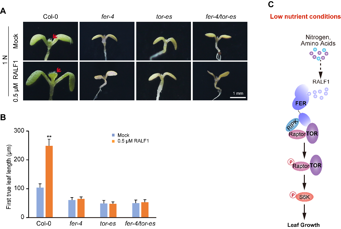 2022年5月17日,Molecular Plant在线发表了于峰教授课题组题为“The RALF1-FERONIA Complex Interacts with and Activates TOR Signaling in Response to Low Nutrients”的研究论文,该论文报道了在低氮条件下,RALF1-FER激活TOR信号通路,促进真叶生长的机制。本研究发现在低氮营养条件下,植物受体激酶FER与TOR相互作用调控营养(氮和氨基酸)信号。FER/RIPK复合体磷酸化TOR复合体组分RAPTOR1B,从而激活TOR信号通路。RALF1通过增强FER-TOR互作增加幼叶中TOR活性,从而促进低氮营养下拟南芥真叶的生长(图1)。