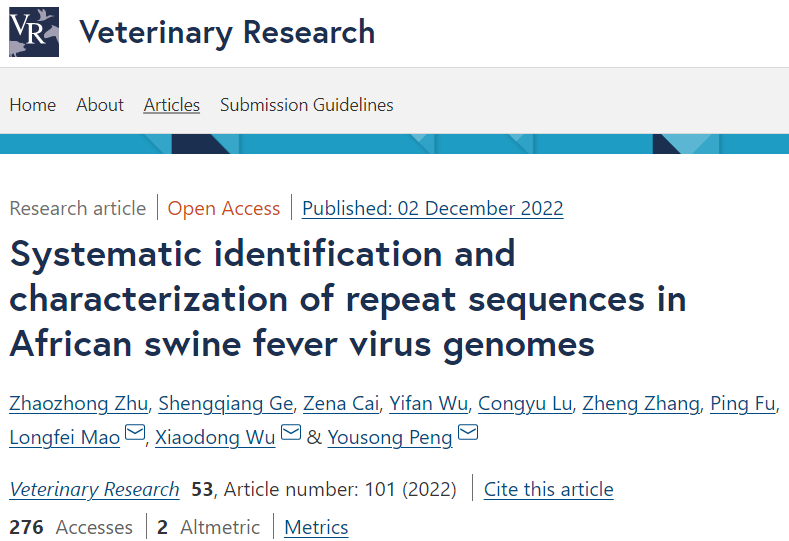 论文4:Zhaozhong Zhu#, Shengqiang Ge#, Zena Cai, Yifan Wu, Congyu Lu, Zheng Zhang, Ping Fu, Longfei Mao*, Xiaodong Wu*,Yousong Peng*. Systematic identification and characterization of repeat sequences in African swine fever virus genomes.Veterinary Research, 2022, 53,101,https://doi.org/10.1186/s13567-022-01119-9