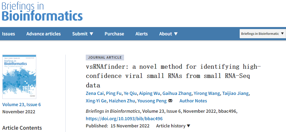 Zena Cai, Ping Fu, Ye Qiu, Aiping Wu, Gaihua Zhang, Yirong Wang, Taijiao Jiang, Xing-Yi Ge, Haizhen Zhu, Yousong Peng, vsRNAfinder: a novel method for identifying high-confidence viral small RNAs from small RNA-Seq data, Briefings in Bioinformatics, bbac496, https://doi.org/10.1093/bib/bbac496