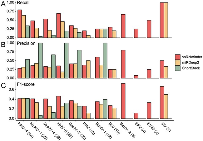 该研究进一步将vsRNAfinder与目前广泛使用的sRNA识别工具miRDeep2和ShortStack进行比较,发现vsRNAfinder大大提高了识别病毒sRNA的敏感度(Recall),在综合评分(F1-score)上也优于其他识别工具,同时在运行速度上也快于其他识别工具。由此可见,该研究为病毒sRNA的识别提供了一种有效且快速的方法。