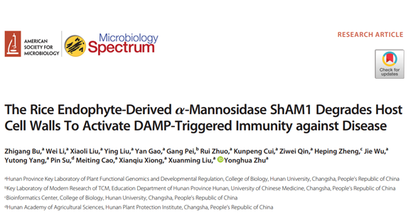2023年4月18日,球王会体育官网朱咏华教授团队在中科院一区TOP期刊Microbiology Spectrum (IF: 9.043)发表题为“The Rice Endophyte-Derived α-Mannosidase ShAM1 Degrades HostCell Walls To Activate DAMP-Triggered Immunity against Disease”的研究论文。该研究首次证实了内生菌来源的α-甘露糖苷酶可通过降解宿主水稻细胞壁释放低聚糖作为DAMPs来激活宿主的免疫反应,从而增强宿主水稻抵抗稻瘟病的能力。