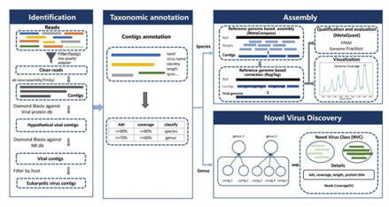 VIGA由四个模块组成,包括病毒鉴定模块(Identification)、分类注释模块(Taxonomic annotation)、组装模块(Assembly)和新病毒发现模块(Novel virus discovery),可在Github上获取(https://github.com/viralInformatics/VIGA)。
