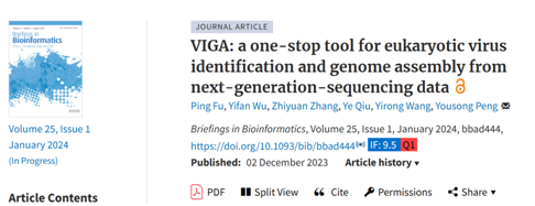 Fu P, Wu Y, Zhang Z, Qiu Y, Wang Y, Peng Y. VIGA: a one-stop tool for eukaryotic virus identification and genome assembly from next-generation-sequencing data. Briefings in Bioinformatics. 2023 Nov 22;25(1):bbad444. doi: 10.1093/bib/bbad444. PMID: 38048079; PMCID: PMC10753531.