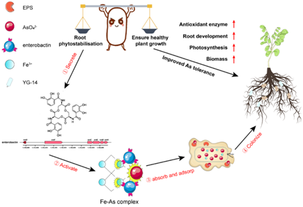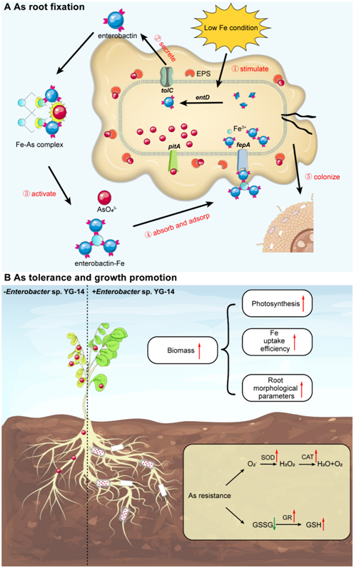 研究从表型、生理生化和分子水平系统揭示了内生细菌通过分泌铁载体enterobactin活化南方红壤中的砷铁化合物,并以定殖方式提高修复植物根部固定水平,最终实现土壤砷污染植物修复的目的。论文为今后利用微生物次生代谢产物开展环境污染治理提供了有价值的参考。