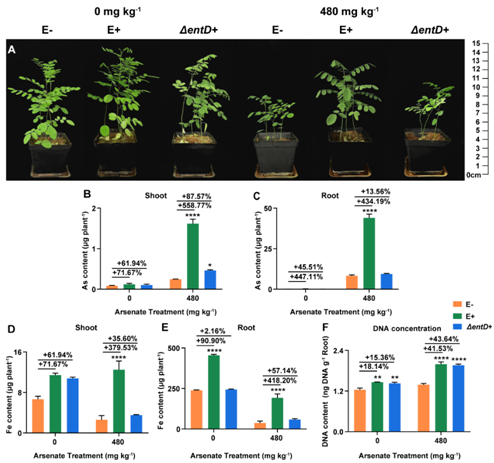 ΔentD的刺槐地下部分和地上部分砷含量变化;D-E.接种YG-14或者ΔentD的刺槐地下部分和地上部分铁含量变化;F.刺槐地下部分YG-14或者ΔentD定殖量。