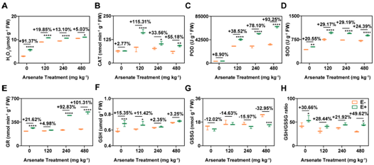 为了探究YG-14促进刺槐根部砷固定是否对刺槐造成损害,测定了接种了YG-14的刺槐根部过氧化氢含量以及抗氧化相关酶的活性。结果表明砷含量和YG-14定殖水平的提高会造成过氧化氢含量提高。但是,YG-14的定殖也促进了刺槐根部抗氧化酶活性的提高,以更好的保护植物细胞免受氧化损伤。同时,YG-14的定殖促进了谷胱甘肽还原酶(GR)活性水平提高,使得刺槐根部产生更多的还原型谷胱甘肽(GSH),有助于刺槐更好的抵御高砷胁迫带来的损伤。