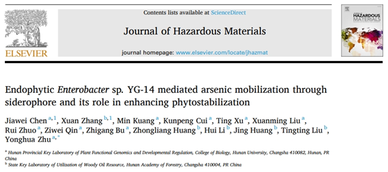 最近,环境领域著名期刊Journal of hazardous materials发表了球王会体育官网和湖南省林业科公司的最新合作研究成果“EndophyticEnterobactersp. YG-14 mediated arsenic mobilization through siderophore and its role in enhancing phytostabilization”。研究通过构建YG-14铁载体—肠杆菌素合成基因缺失突变体(ΔentD),证实内生菌通过分泌铁载体有效促进了矿物土壤中铁砷络合物的活化,释放可被生物利用的铁和砷到根际中,进一步通过胞外聚合物和特定的磷酸酶转移蛋白PitA吸附和吸收环境中的砷,最终通过定殖的方式将环境中的砷固定在修复植物根部,实现土壤砷污染植物根部固定修复。研究从表型、生理生化和分子水平揭示了内生菌在促进修复植物固定砷和维持宿主植物生长中的重要作用。