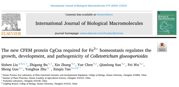 2024年6月18日,球王会体育官网朱咏华教授团队与湖南省植物保护研究所谭新球研究员团队合作在中科院一区TOP期刊International Journal of Biological Macromolecules (IF: 8.2)发表题为“The new CFEM protein CgCsa required for Fe3+ homeostasis regulates the growth, development, and pathogenicity of Colletotrichum gloeosporioides”的研究论文。该研究首次揭示CFEM效应蛋白CgCsa在C. gloeosporioides的致病性、细胞壁和细胞膜的完整性以及生长发育中起着关键作用,并且CFEM效应蛋白能够结合铁,维持C. gloeosporioides的铁稳态,动态调控病原菌生长和致病过程。