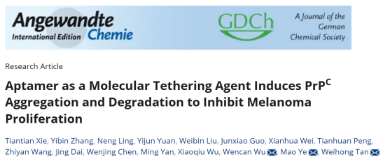 近日,球王会体育官网谭蔚泓院士/叶茂教授团队在Angewandte Chemie International Edition在线发表了题为“Aptamer as a molecular tethering agent induces PrPC aggregation and degradation to inhibit melanoma proliferation”的研究论文。该研究首次证实,基于核酸适体构建的分子束缚剂,可通过诱导黑色素瘤中细胞阮蛋白(PrPC)的非天然聚集,激活细胞内蛋白质量控制系统,促进PrPC的溶酶体途径降解,实现抗黑色素瘤的功能活性。这一研究不仅为开发靶向PrPC的抗肿瘤药物奠定了理论基础,而且为发展新型靶向蛋白降解策略提供了重要科学依据。